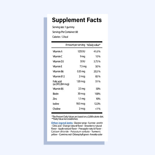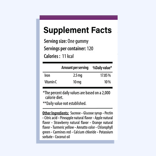 Each serving contains 5 mg of iron and 20 mg of vitamin C to enhance absorption. This product is also suitable for adults.